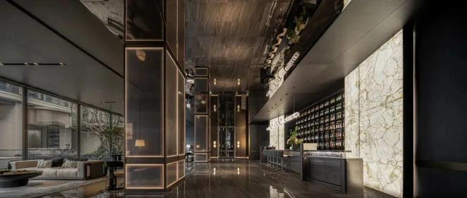 楼栋入户之处,更是匠心独运。外凸的设计搭配柔和的地灯映水,营造出一种温馨而神秘的氛围。奢华的金色铝板装饰边框,精致的四阶纹理地砖,以及金属光泽线条格栅与深邃云纹石材的巧妙搭配,共同营造出一种极致的仪式感与尊贵体验,让人在归家的路上,便能感受到那份与众不同的尊贵与荣耀。
